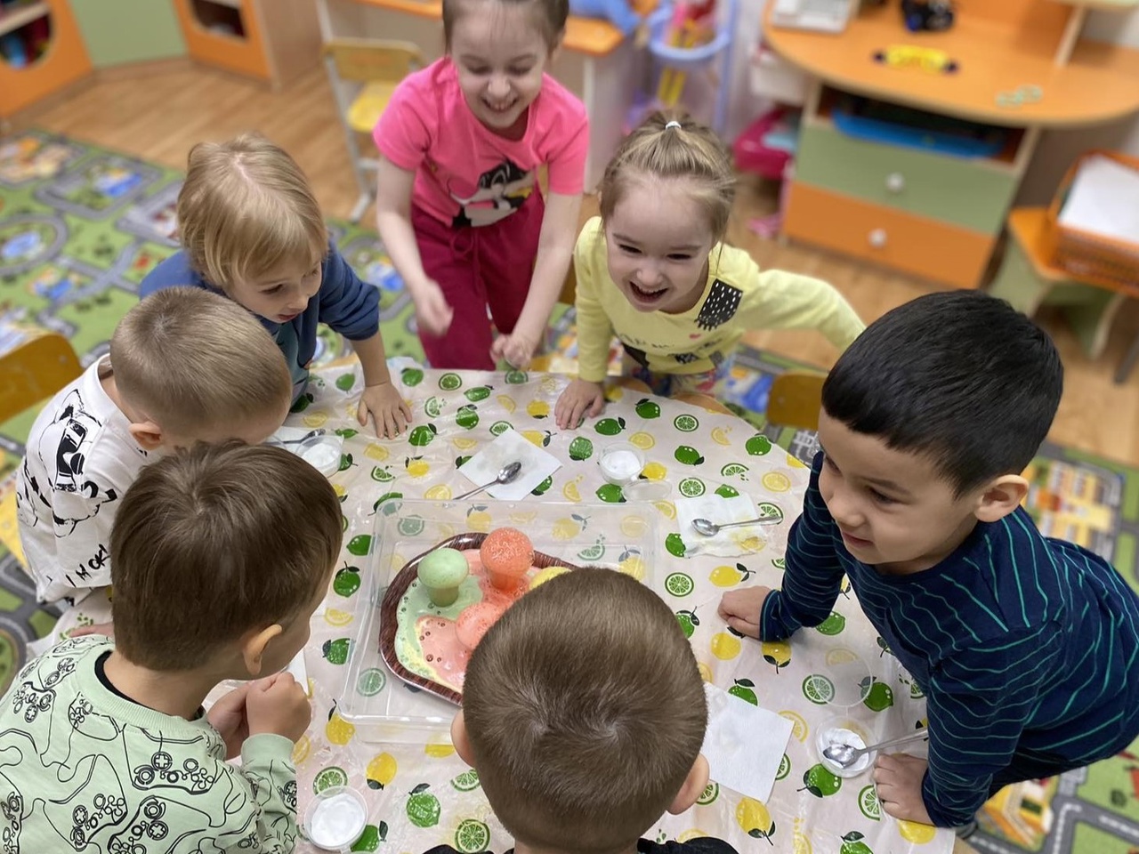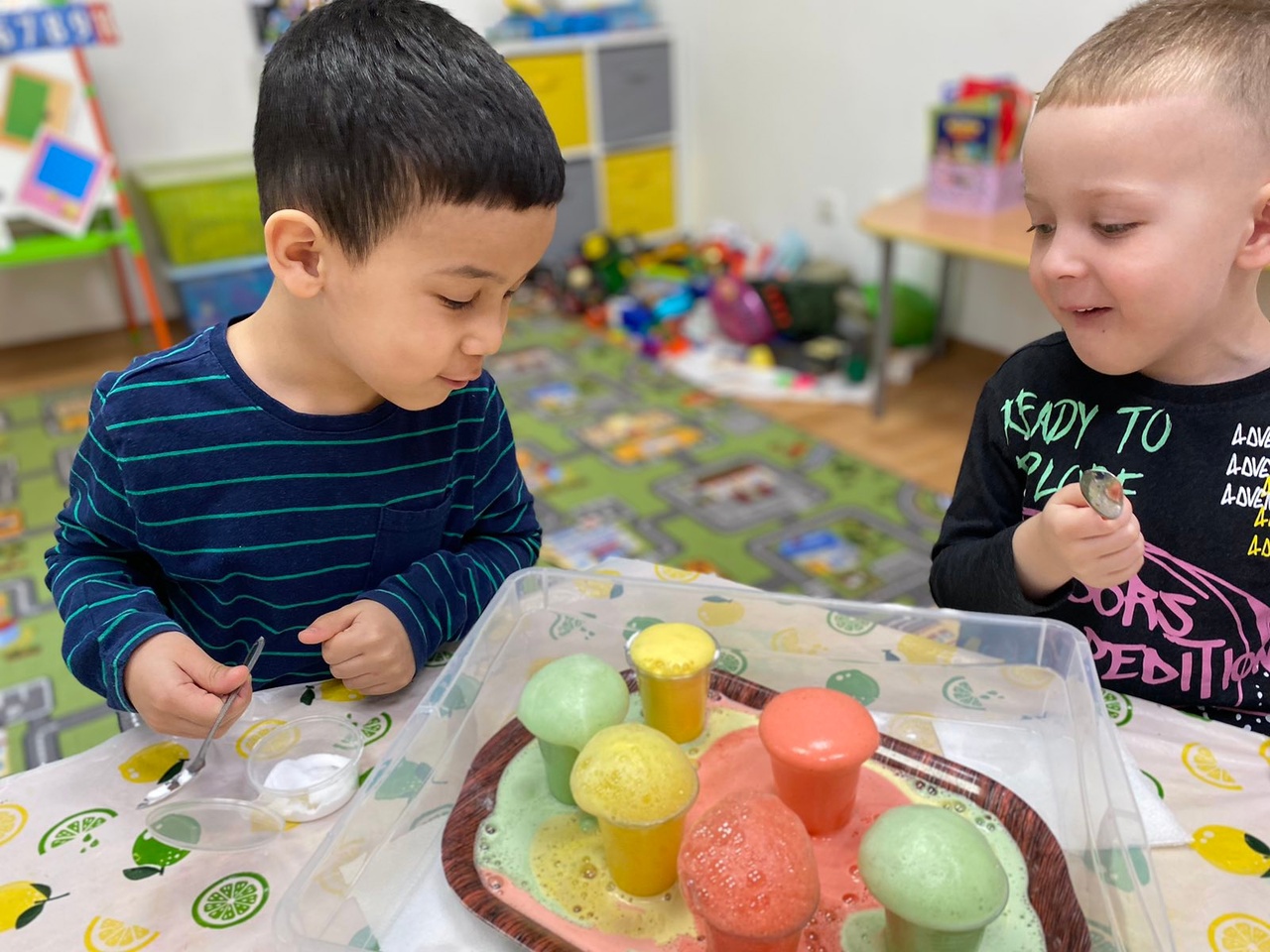 Далее был опыт на проверку вкуса, в результате процесса дети поняли, что вода сама по себе безвкусна, но принимает вкус добавленных веществ, таких как соль и сахар. Но особенно ребятам понравился опыт "Разноцветная вода", где они убедились, что вода бесцветная, при этом она может приобретать цвет веществ, добавленных в неё. А уже в цветную воду ребята добавили соду и лимонную кислоту, получив цветную пену.